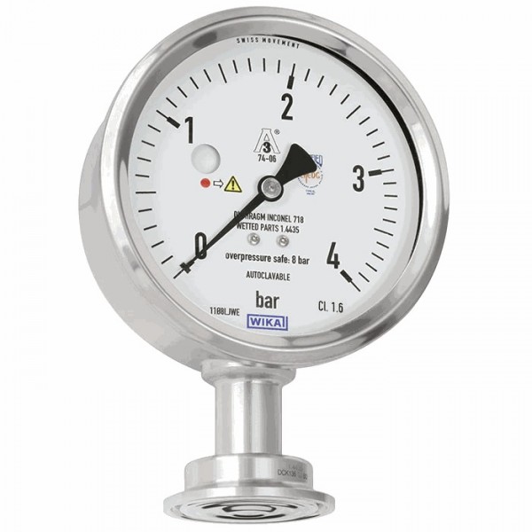 The flush welded diaphragm element in conjunction with the aseptic process connections enables a dead-space free connection to the process. The independent pressure display, needing no external power, finds applications with the processing and transport of high-quality and critical media, for example on portable tanks.
